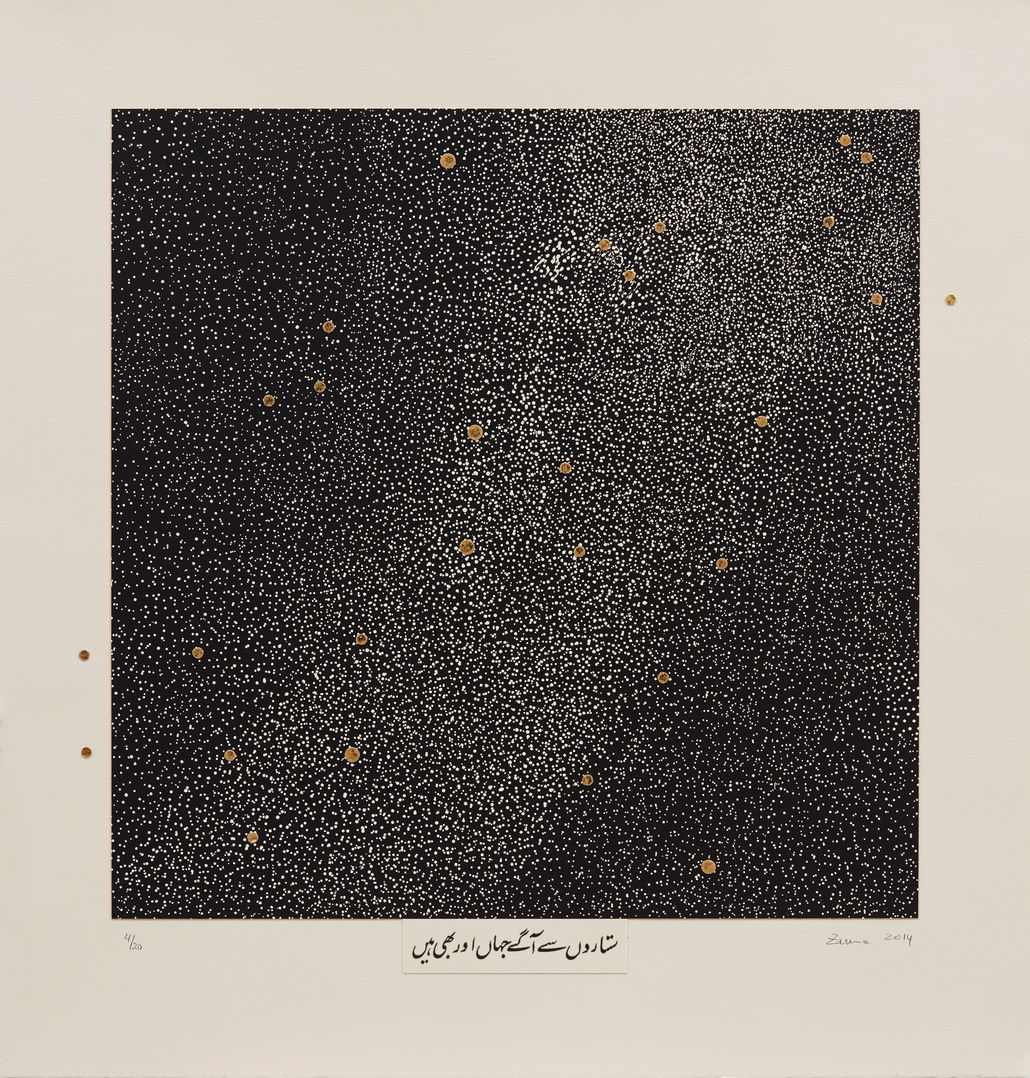 Woodcut printed on BFK light paper collaged with gold leaf and Urdu text Mounted on Somerset Antique paper Dimensions: 24 x 23 inches